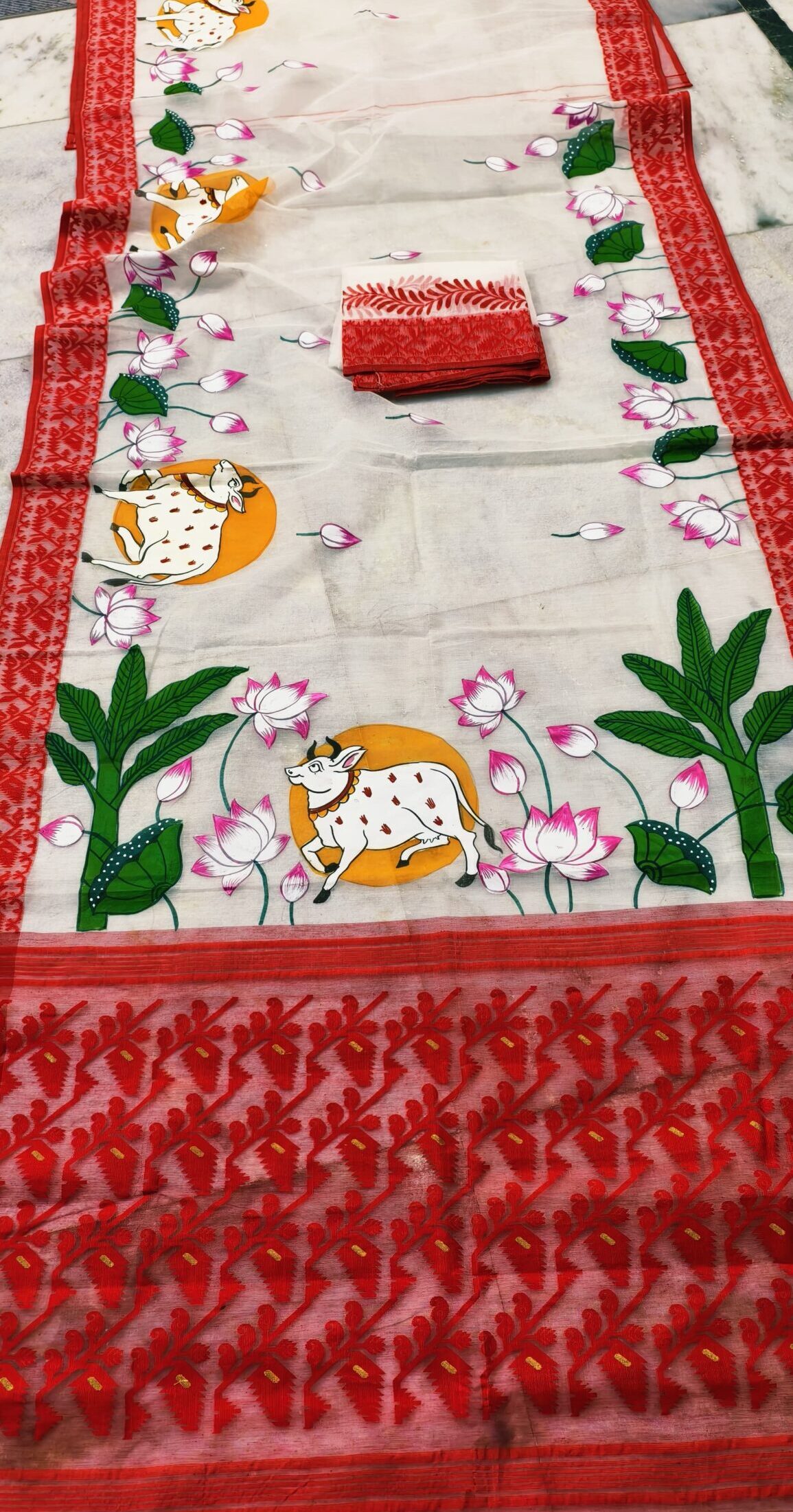 | Border | An auspicious Red Jamdani cutwork border featuring geometric floral patterns that frame the sacred story Of the Kamdhenu(cow) and the divine lotuses painted in the Potochitra style. |