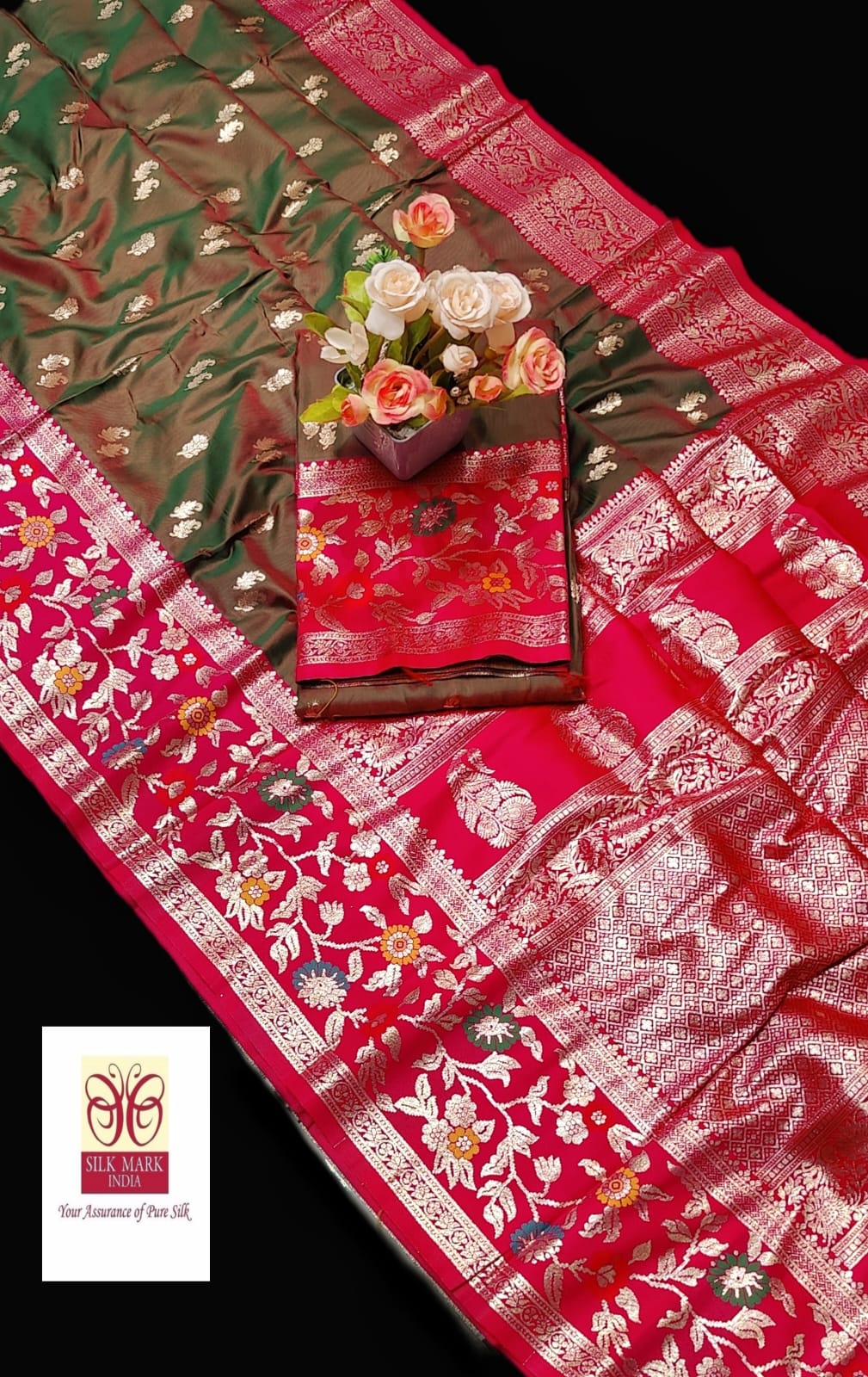 | Colour | Deep mehendi green with contrast Red border and pallu. |